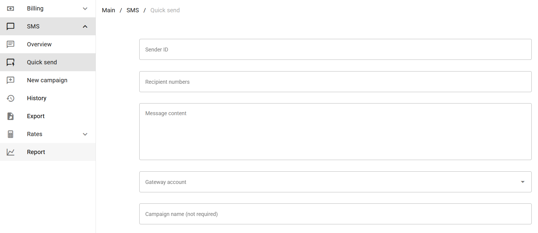 To send an SMS quickly via the web interface, go to "[**Quick send**](https://app.miatel.com/sms/fast/new)**"** in the SMS menu.
